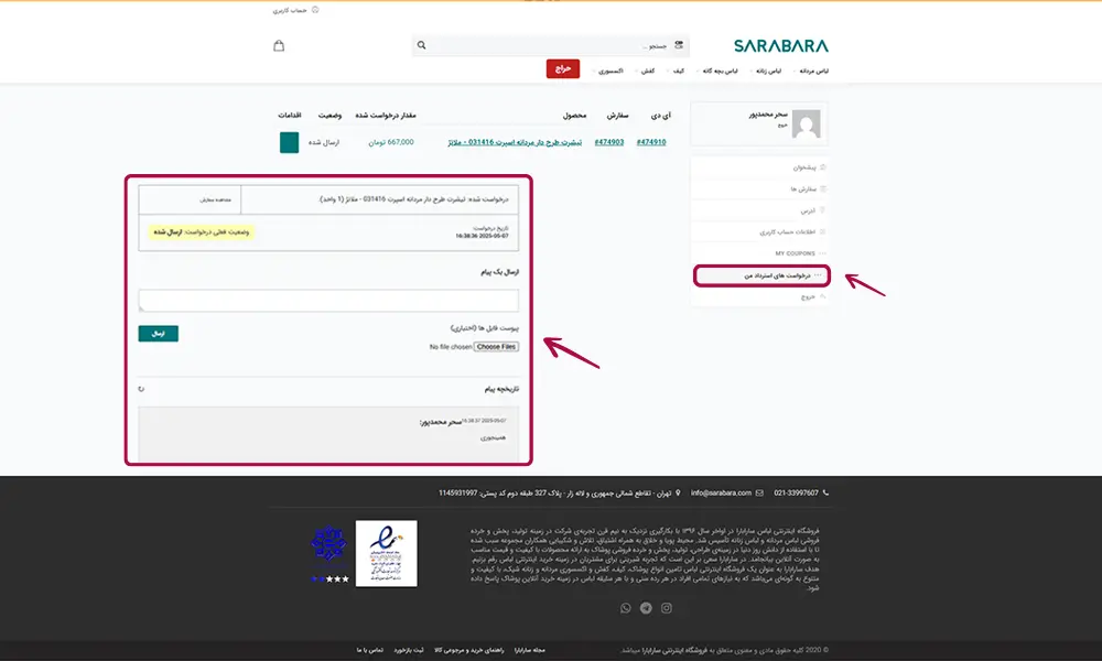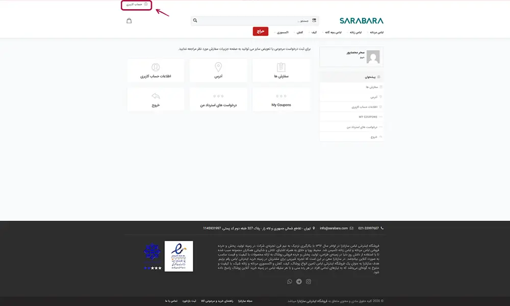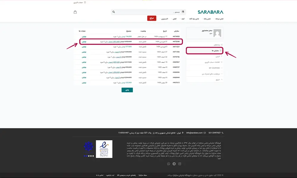گزینه سفارشات من را بزنید تا تمام سفارشات شما از سارابارا نمایش داده شود. سفارشی را که قصد تعویض یا مرجوعی آن را دارید و کمتر از 7 روز از دریافت آن گذشته باشد را انتخاب کرده،و دکمه مشاهده را بزنید.